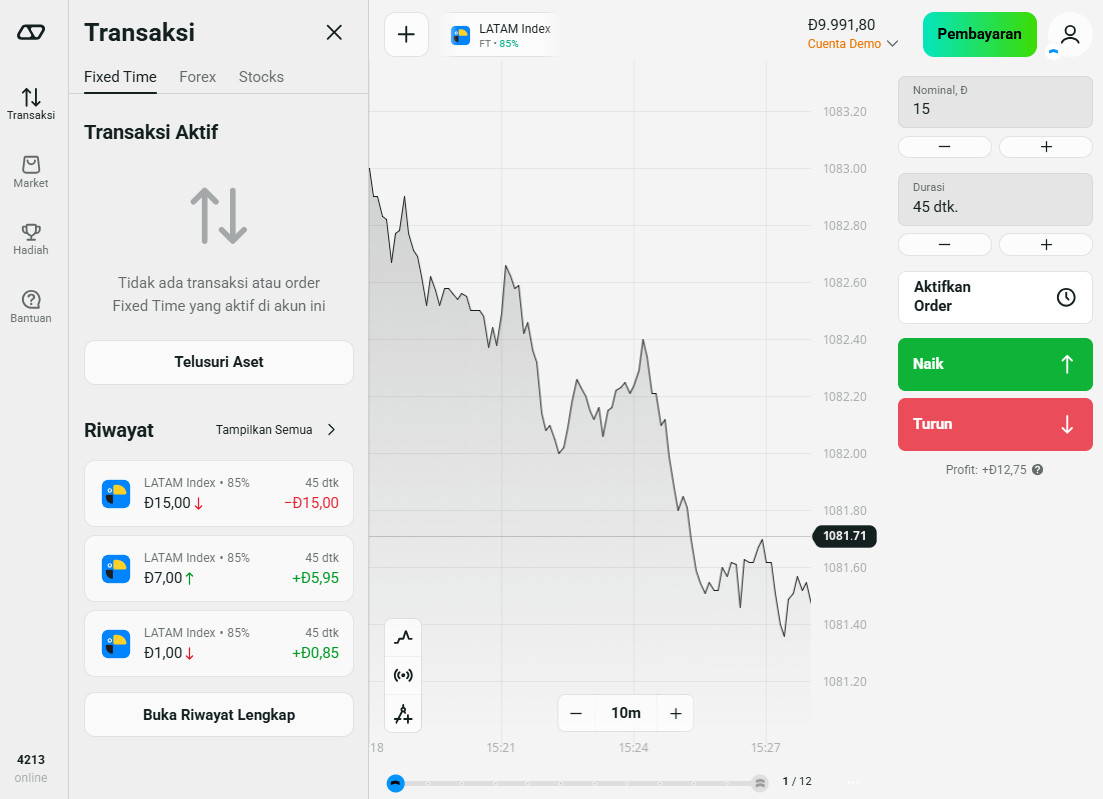 Platform menyediakan beberapa mode: Fixed Time untuk transaksi dengan waktu tertentu.